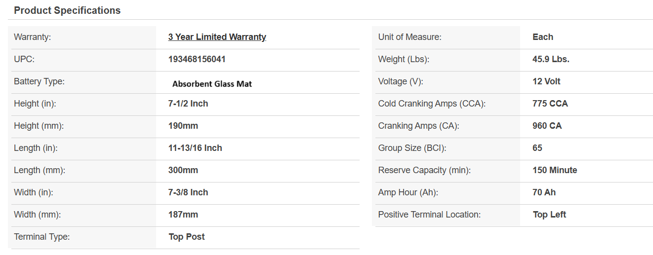 ACDELCO Premium AGM Group 65 775 CCA